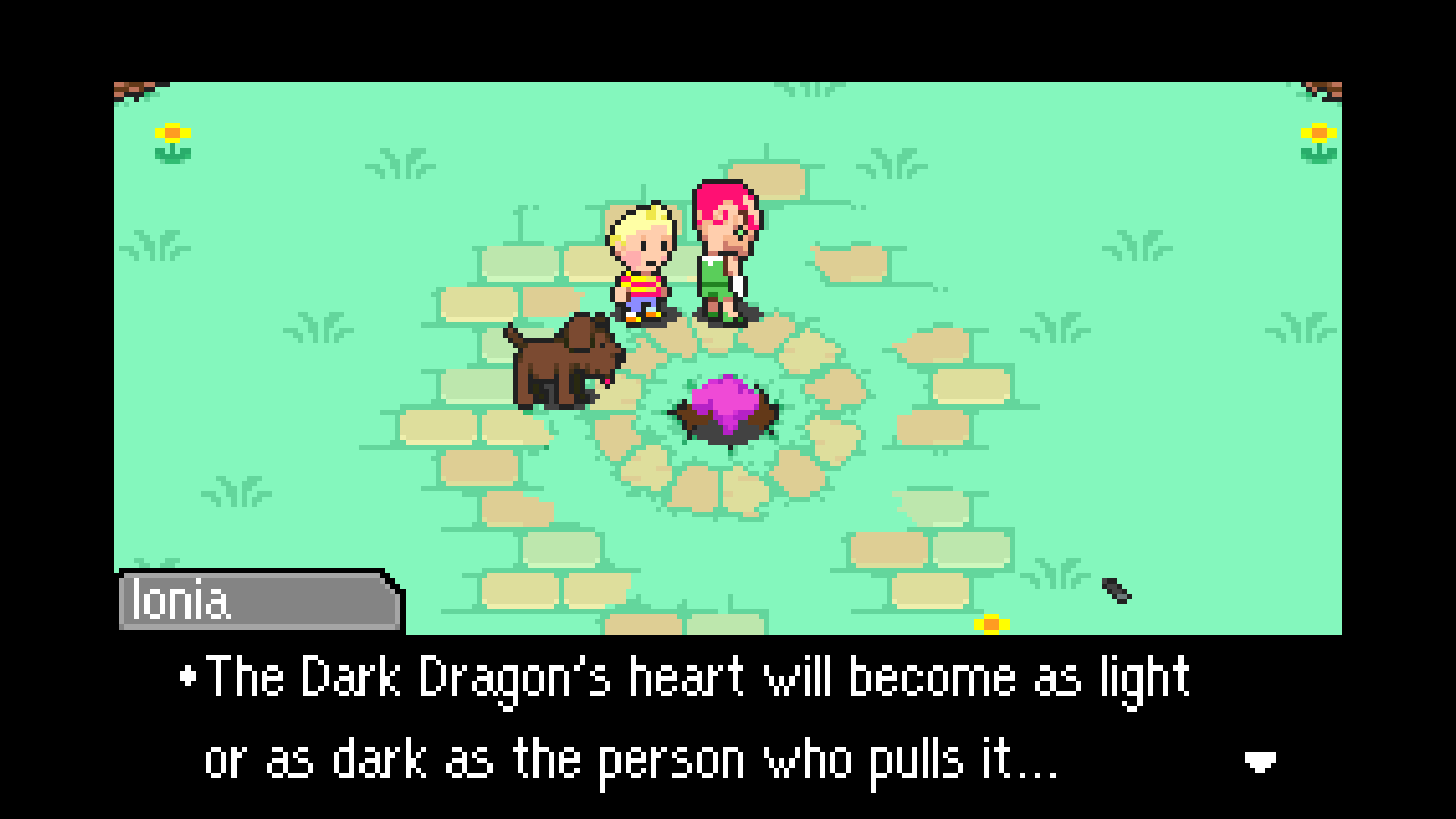 Ahora viene el dato importante: si el dragón es la Tierra y este despertará según el corazón de aquel que haya liberado las agujas, entonces la Tierra (Mother) estará bajo el dominio del bien o del mal según como sea el elegido. Si es malvado se desatará el caos y la destrucción en el mundo, si es bueno lo contrario. Para rematar el asunto, hay una conversación en la que Iona dice específicamente que solo aquellos que dominan PK Love son los que pueden liberar las agujas, apelando a la pasión o el amor del jugador por el nombre que haya escogido al inicio del juego sobre cuál es su cosa favorita. Es decir, este juego va sobre quién domina la Tierra y cómo la domina.