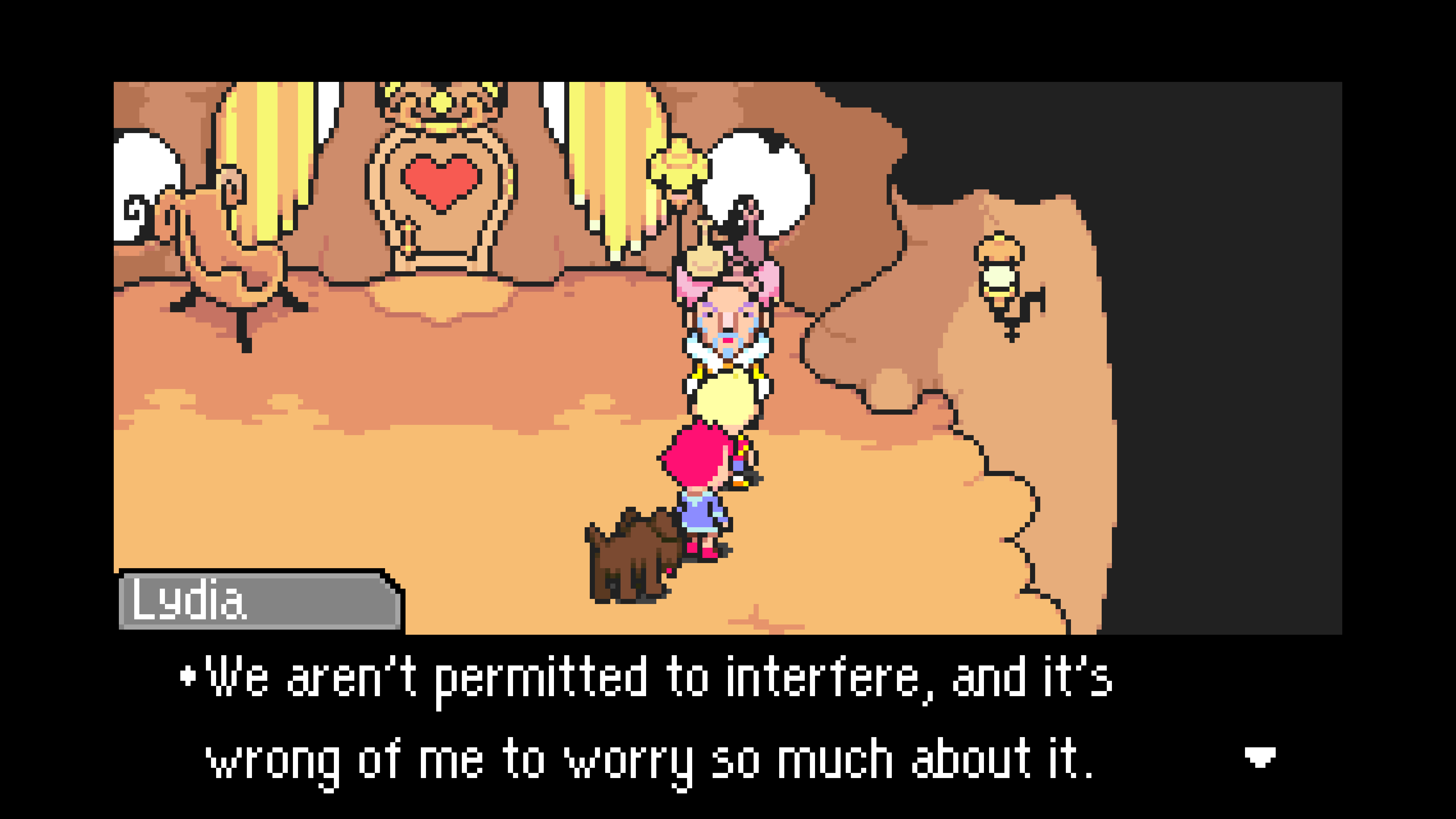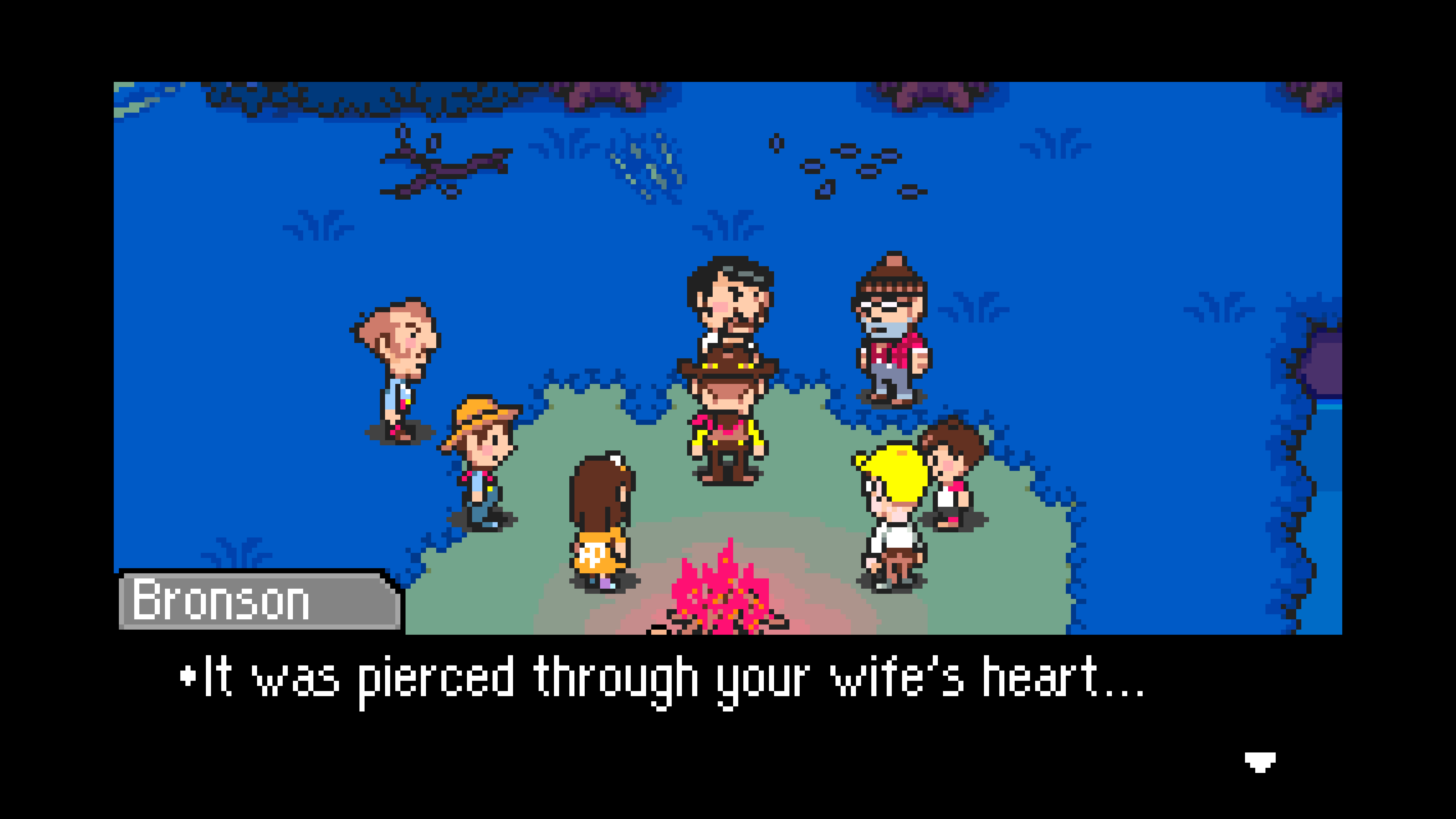 Debemos ser francos: en EarthBound Itoi estaba jugando, pero es en Mother 3 donde se pone a trabajar de verdad. No hablaré del prodigio técnico que es este juego y de la infinidad de detalles que demuestran constantemente el cariño y atención que pusieron en él, porque para eso ya existen cientos de análisis desde hace años. Solo decir que hay animaciones que duran apenas un segundo y te lo dicen todo de los personajes y su mundo. ¿Qué esperas de un juego que te crea un sprite individual para cada habitante de Tazmily con su propio nombre y que, según avanzas en la historia y te los encuentras en distintos lugares, sigues sabiendo quién es, qué hacía antes de estar ahí y cuál es su debilidad o su fortaleza? Mother 3 no solo cuenta la historia de Lucas (y su perro); es una historia colectiva, de todos, y de cómo el mundo cambia según sus acciones mientras unos sucumben y otros resisten. Quizás el pixel art y los colores pastel de este título den una impresión infantil de lo que Mother 3 representa (para sorpresa de nadie en Nintendo), pero estamos ante uno de los juegos más maduros y significativos de la industria. Maduro no por la crudeza de sus escenas (maltrato animal, por ejemplo), ni por sus referencias al alcohol o a las drogas (un menor de edad se toma setas alucinógenas y luego lo espabilan atizándolo con una vara de madera), ni siquiera por esas ligeras insinuaciones +18… Nada de eso. Mother 3 es un juego maduro por el elevado grado de amor que es capaz de mostrar desde la más diáfana sencillez. El amor que contiene este cartucho está muy por encima de lo que el humano medio puede percibir. Esto hace de Mother 3 un juego muy especial, pero también muy incomprendido.