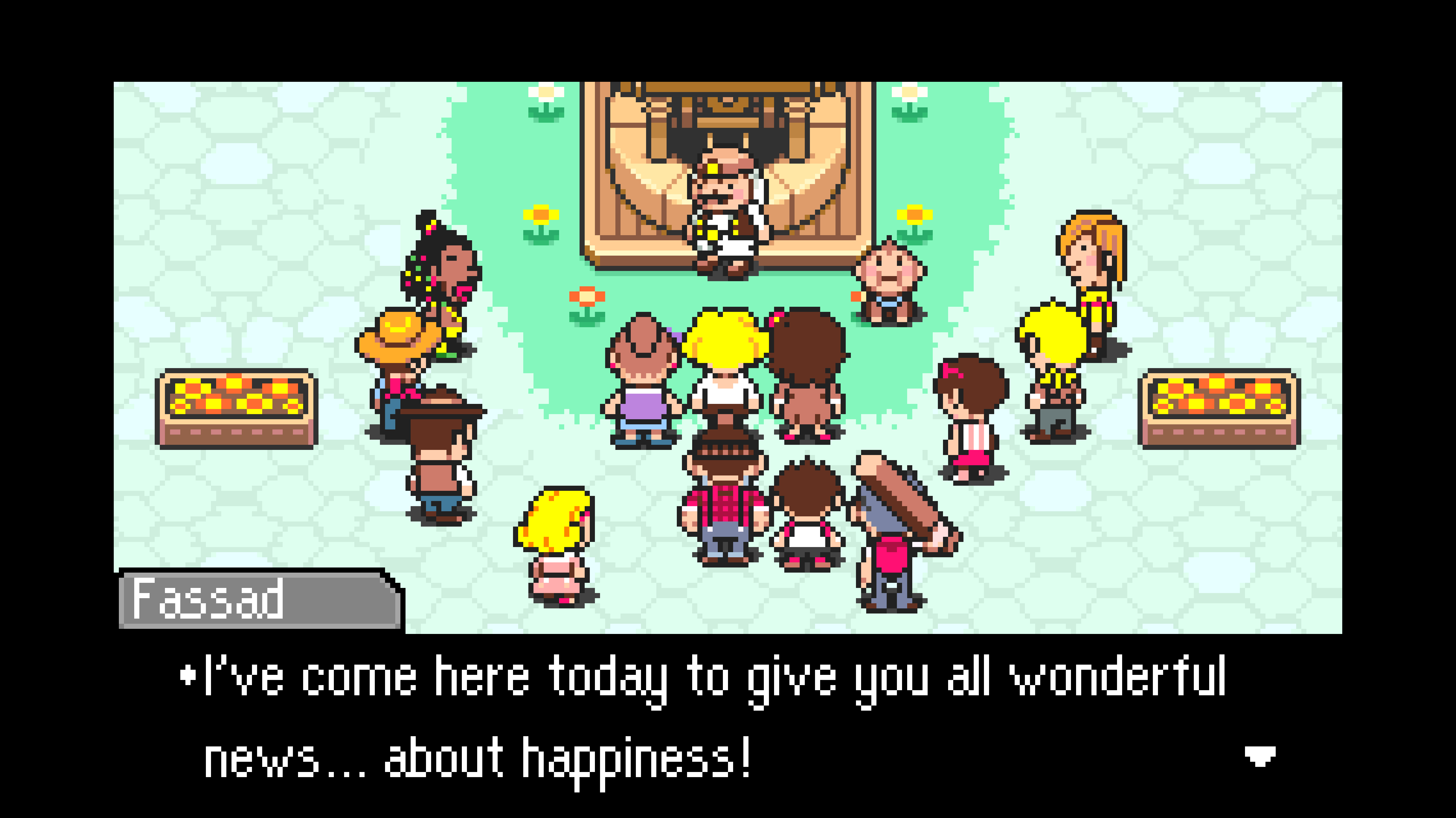 Un buen día llega a Tazmily un foráneo que responde al nombre de Fassad. Viene con su mono de feria, el cual da saltitos y baila mientras el desconocido reúne a los habitantes del pueblo en la plaza central y les habla de algo llamado felicidad. Fassad es un personaje increíble y lo es más cuando descubres realmente quién es. Así como la ambición de Porky es, simplemente, ser el rey del mundo; Fassad es el canal a través del cual la maldad entra en el ser humano. Este personaje es quien siembra las semillas del mal en Tazmily, es quien introduce el dinero (sí, ni siquiera funcionaban con dinero), quien genera disputas entre los vecinos y quien crea las primeras divisiones. Fijaos bien en la escena en la que está dando su discurso en la plaza. Mientras habla de las bondades de un mundo mucho más fácil y cómodo (al mismo tiempo que predice ciertas desgracias que acontecerán, casi como si de pandemias se tratara…) vemos cómo algunos aldeanos se acercan curiosos a escuchar su mensaje a la vez que otros ladean sutilmente la cabeza, niegan por lo bajo y se retiran. El juego nos está mostrando qué personajes están siendo cautivados por la serpiente y cuáles no. Porque, una vez más, Tazmily representa una humanidad abelina: seres bondadosos, pero carentes de sabiduría (por motivos que, además, la historia nos contará después). Solo unos pocos son sabios: los elegidos o los que han sufrido. Estos son, precisamente, nuestros protagonistas.