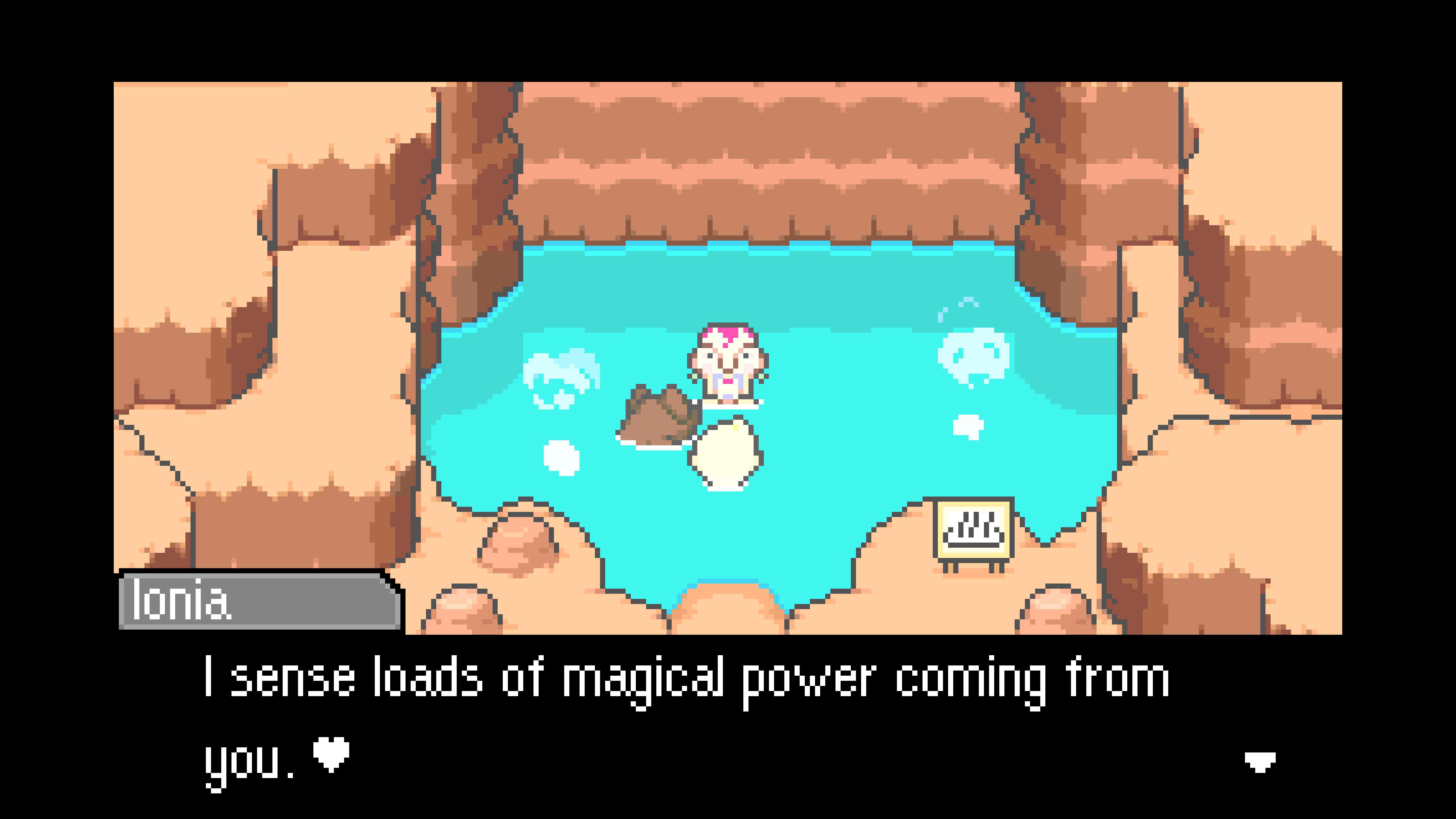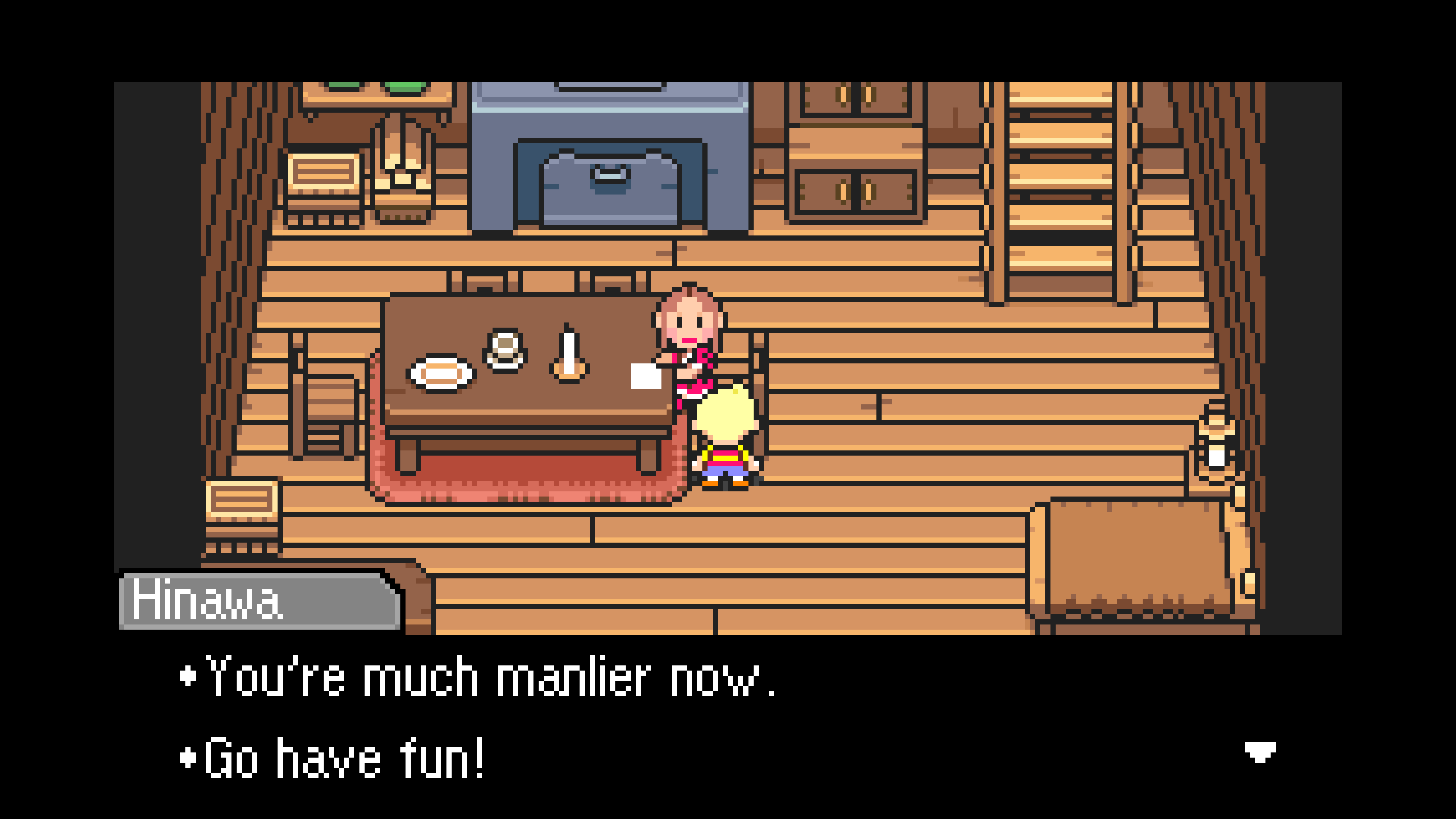 En Mother 3, al igual que ocurre en los juegos anteriores, dan libertad al jugador para que, al inicio de la partida, escoja el nombre de ciertas cosas: el nombre de los personajes principales del juego, el nombre de la mascota, el nombre de su comida favorita, el nombre de aquello que más le gusta, etc. El jugador es libre de poner ahí lo que quiera y después el juego mostrará ese nombre cuando corresponda. Ahora bien, si alguien quiere respetar la intención original de los autores del juego —como suele ser mi caso—, puedes no poner ningún nombre en esas opciones y se asignará automáticamente aquel que sus desarrolladores habían pensado para él. En EarthBound el ataque más poderoso de Ness era el PK Rockin’, nombre que salía por defecto si no escribías nada en la cosa favorita de Ness. Lo mismo pasa aquí: si no escribes nada en la cosa favorita de Lucas, cuando aprenda su ataque más poderoso este se llamará PK Love. Lucas entra en un baño termal y ahí encuentra a Iona, sin ropa, que detecta en el niño un tremendo potencial interior. En la escena, metidos ambos en el baño, Iona se acerca a Lucas y le da la vuelta para que quede dándole la espalda. La pantalla se oscurece y solo se puede leer el diálogo de Iona instando a Lucas que aguante un poco más, que ya casi está. Para cuando recuperamos la visión, Lucas aparece medio hundido en el agua burbujeante, con la cara roja y un mensaje que dice: «Lucas ha aprendido PK Love». Sobra decir que los japonesitos usan la palabra amor y los símbolos de los corazones en muchas ocasiones con connotaciones sexuales.