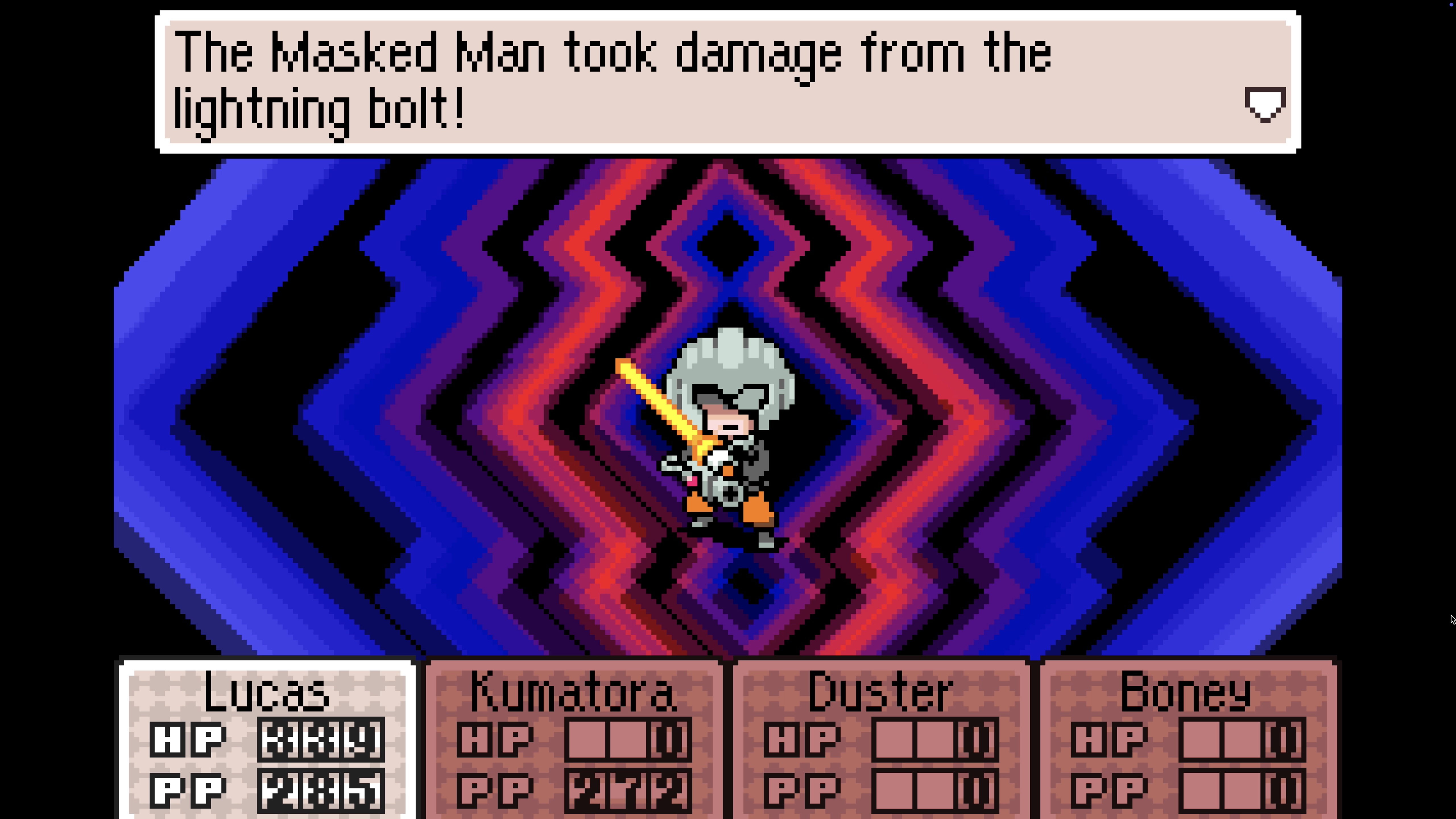 Lucas lleva equipada la Franklin Badge, objeto mítico de la serie que te hace inmune a los ataques eléctricos y devuelve ese mismo ataque a su emisor. Claus tiene un potente ataque de tipo eléctrico que usa a lo largo del juego para ir borrando a sus enemigos del mapa, como ocurre la primera vez que te enfrentas a él. La segunda vez, con la medalla equipada, Claus derrota con ese ataque a todos los miembros del grupo menos a Lucas. Ahí te enfrentas a él por primera vez y lo vences, aunque escapa volandeiro. En este último encuentro ocurre lo mismo, Claus se deshace de todos los demás miembros del grupo, pero no puede usar ese mismo ataque contra Lucas, ya que no solo es inmune, sino que además le devuelve el rayo dañándolo a sí mismo. Así se inicia el clímax del juego.