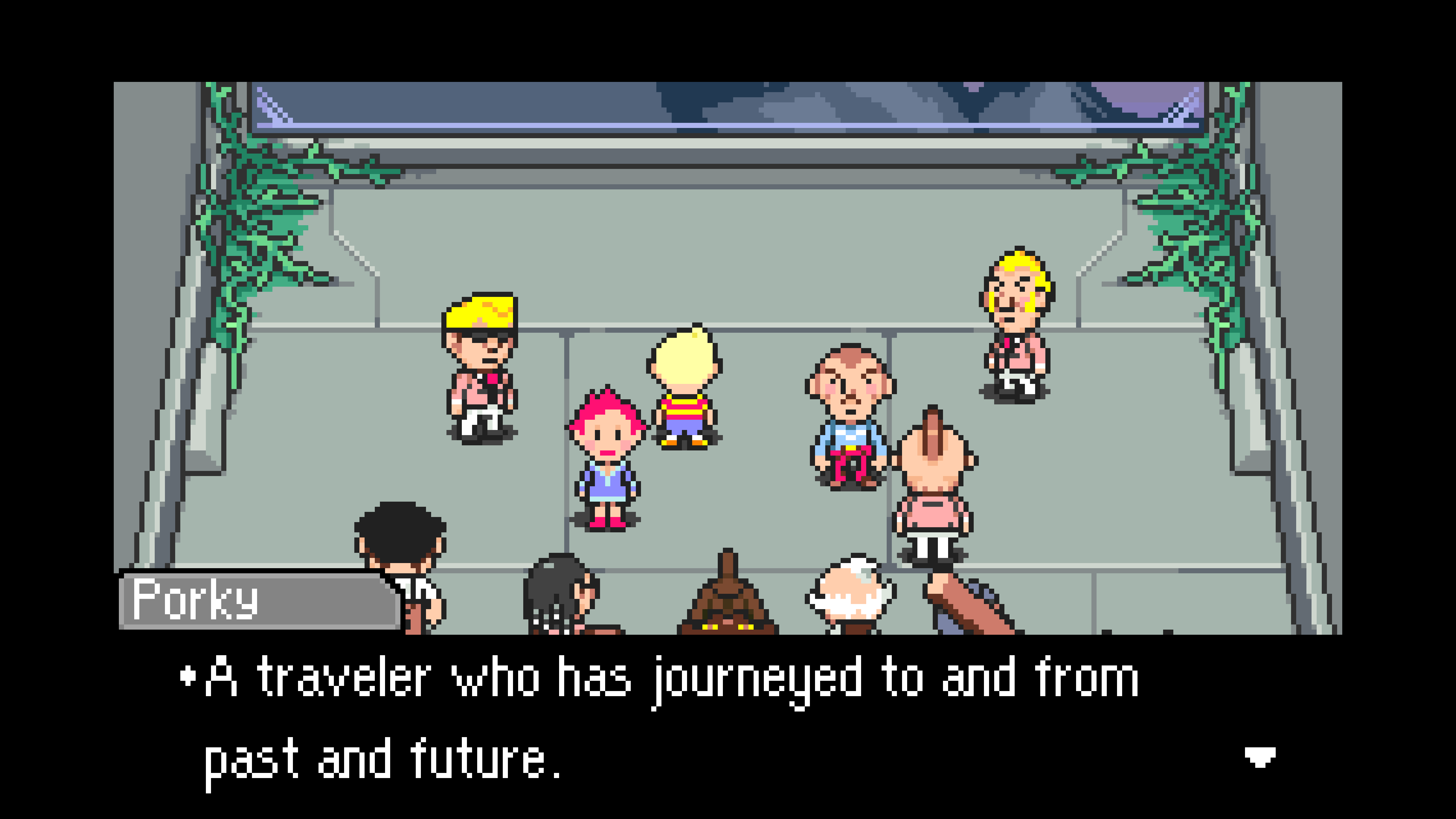 Al inicio del capítulo 8 te vienen a buscar en limusina y te informan de que Porky (sí, el mismo Porky de EarthBound) te ha invitado a New Pork City. Esta es la primera vez que se menciona el nombre del villano del juego. Aunque, para ser justos, Porky es más bien una herramienta de Locria, pues este encuentra en él los males idóneos para llevar a cabo sus planes. Me encanta la forma en la que ha sido maltratado este personaje en Mother 3, porque muestra a la perfección cómo la debilidad del ser humano lo carcome por dentro hasta el punto de cesar toda interacción por miedo a vivir. Si recordamos a Porky en EarthBound, era el vecino pesado de Ness, el que se iba encontrando por todas partes y se burlaba de él cuando tenía la ocasión. La rivalidad y odio de Porky hacia Ness fue tal que se entregó sin dudarlo a Giygas con el fin de obtener poder y así superar a su vecino. Esto lo condenó también al viaje espacio-tiempo, metido en una suerte de cápsula que lo mantendría con vida indefinidamente. Tras el combate final, Porky queda deambulando por el universo hasta dar con otra realidad en Mother 3. Él mismo se declara como un viajero del pasado-futuro.