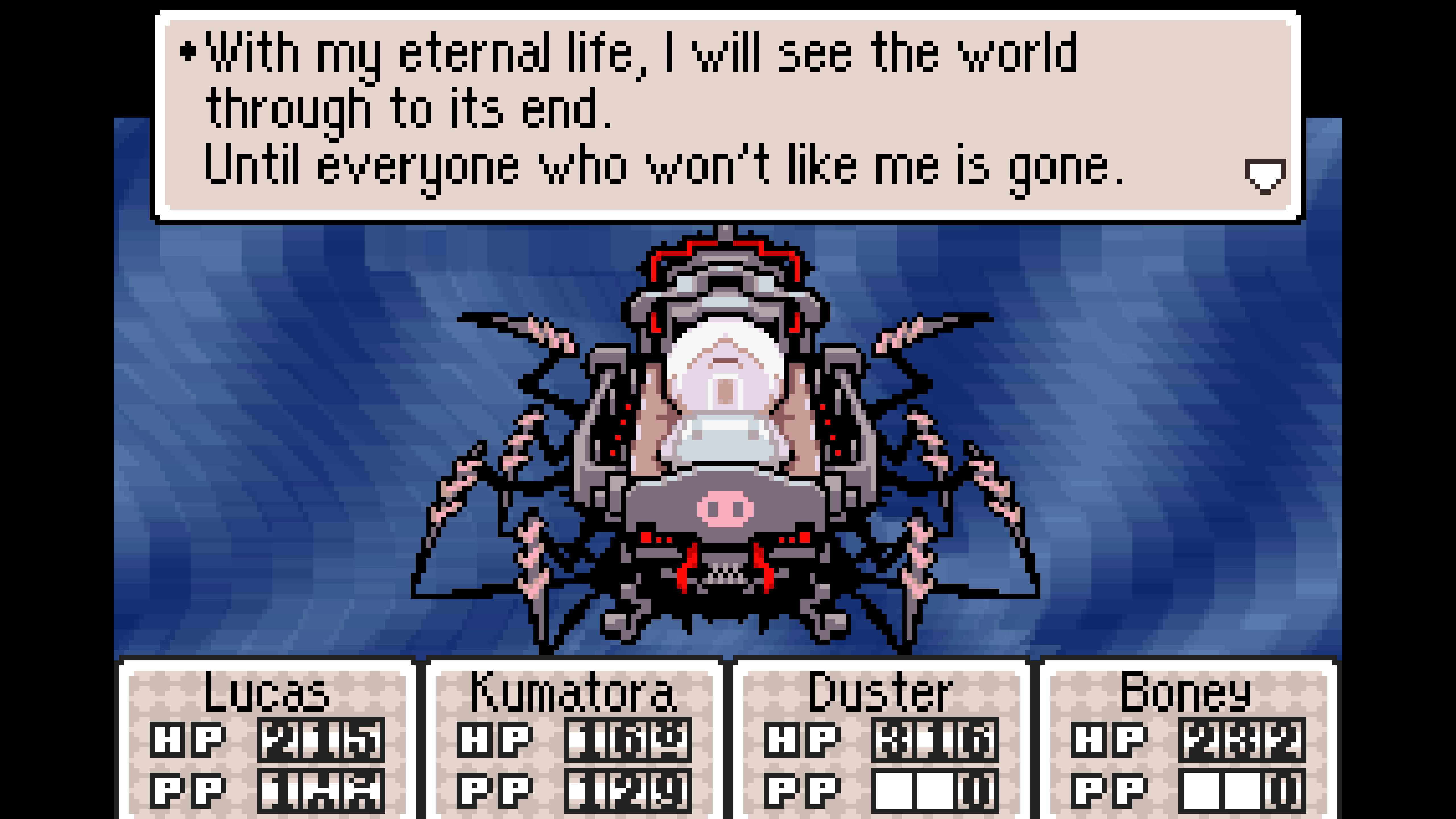 La forma en la que es llevado este combate, la manera en la que las frases expresan las sensaciones de cada momento, la velocidad del texto, la música entrando y saliendo según se desprenden las capas de la cebolla… Este combate es el epítome de Mother. Cuando ambos hermanos están al borde de la muerte y su conciencia deambula entre mundos es cuando oyen la voz de Hinawa, su madre, suplicándole a Claus que deje de atacar a su hermano y que recuerde quién es. Entre frase y frase se mezclan los ataques contundentes del hermano mayor, atacando físicamente o con su PK más potente, que es el mismo que el tuyo: PK Love. Claus usa todos los ataques posibles excepto el eléctrico, ya que en ese estado lo mataría. Así continúa una y otra vez, frase tras frase, hasta que a Lucas se le empiezan a agotar los PP y los puntos de vida alcanzan cifras críticas. La música va y viene, como un oleaje entre la vida y la muerte. Ambos están agotados. Un mensaje dice textualmente que Lucas ha perdido la voluntad de seguir luchando, al mismo tiempo que Claus cada vez golpea más lento, más torpe. Al poco, este empieza a mirar a su alrededor, como si oyera algo. La voz de su madre empieza a calar en su corazón, más presente ahora que su mente. Finalmente, tras varios ataques más, Claus se detiene, exhausto. Lucas, exhausto, lo mira fijamente. Su hermano mayor alza sus manos y se saca el casco. Entonces lo vuelve a ver, los dos hermanos vuelven a verse juntos, uno delante del otro, por última vez. La voz de Hinawa lo llama a acudir a su lado. En ese instante Claus comprende todo el dolor y todo el amor del mundo, concentrados en un único punto. Alza su arma y ejecuta por propia voluntad su último ataque eléctrico, el último acto de amor de Claus que lo llevará junto a su madre. No hay palabras que hagan justicia a este final, solo puede ser jugado.